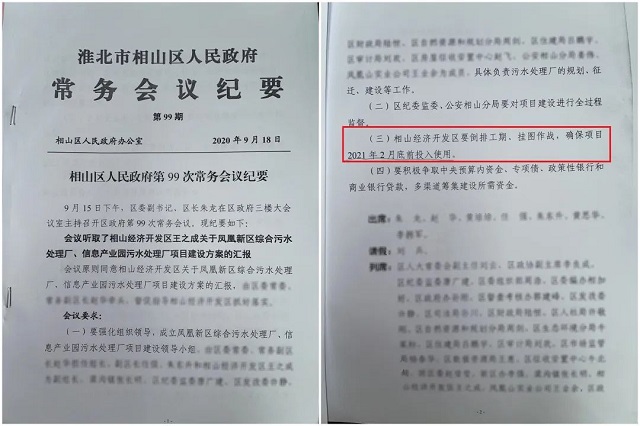 偏偏相山區(qū)一點也不急,嘴上喊著已經(jīng)在走流程了,其實是2020年9月才研究部署食品工業(yè)園污水處理廠建設(shè)工作,并且相關(guān)工作僅停留在文件上,直至本次督察進(jìn)駐前夕,相山區(qū)才再次啟動污水處理廠的建設(shè)工作,目前尚處于項目土地報批階段。