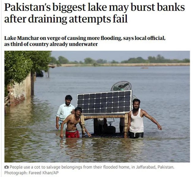 據《衛報》9月5日報道,巴基斯坦一名高級官員警告說,該國最大淡水湖曼查爾湖瀕臨決堤。此前,巴基斯坦當局試圖以一種可控的方式排水,但以失敗告終。