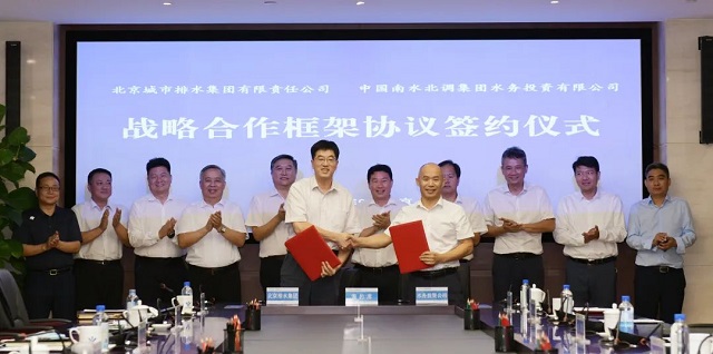 張榮兵、杜國志代表雙方簽署了戰(zhàn)略合作協(xié)議。根據(jù)戰(zhàn)略合作協(xié)議內(nèi)容,雙方將充分發(fā)揮央地合作優(yōu)勢,圍繞生態(tài)環(huán)境綜合治理、排水管網(wǎng)運維、污水處理及再生水利用、市政供水、區(qū)域水網(wǎng)建設(shè)等領(lǐng)域,聚焦協(xié)同推動市場開發(fā)、深度開展項目合作、促進(jìn)智慧水務(wù)建設(shè)、共創(chuàng)水環(huán)境治理新模式、加強(qiáng)人才交流培養(yǎng)等五大方向,加快區(qū)域和地方水網(wǎng)建設(shè),推動中國南水北調(diào)集團(tuán)水務(wù)投資公司做強(qiáng)做大,促進(jìn)北京排水集團(tuán)服務(wù)、品牌輸出戰(zhàn)略轉(zhuǎn)型,引領(lǐng)全國排水行業(yè)高質(zhì)量發(fā)展。