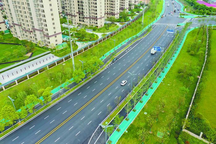 鷹東大道海綿化改造項目在城市道路主脈絡(luò)上落實了海綿城市理念,奏響了和諧共生新樂章。該項目位于信江新區(qū)北部,北起龍虎山大道,南至鷹東大橋北側(cè)橋頭,道路全長約4.3公里,新建道路斷面24米至55米,定位為城市主干道。通過開口路緣石將車行道內(nèi)雨水引入側(cè)分帶內(nèi)下沉式綠地;在人行道下設(shè)置過水通道,將非機動車道雨水引入防護綠地,防護綠地同時還收集相鄰地塊內(nèi)徑流,經(jīng)下沉式綠地凈化、滯蓄后排入雨水管道,實現(xiàn)了道路海綿設(shè)施與周邊地塊的結(jié)合與聯(lián)動,增強了海綿城市建設(shè)的系統(tǒng)性;人行道采用透水鋪裝,滲排管收集滲水排入雨水管道,實現(xiàn)了對道路全斷面徑流的管控。建成后年徑流總量控制率為82.8%,透水鋪裝面積為3.2585萬平方米,透水鋪裝率14.6%,SS(固體懸浮物)去除率為74.52%。此外,由于鷹東大道雨水管道雨水排入相鄰石鼓渡河,故而在雨水排口處做消能及生態(tài)化處理措施,進一步消除面源污染,保障入河水質(zhì)。