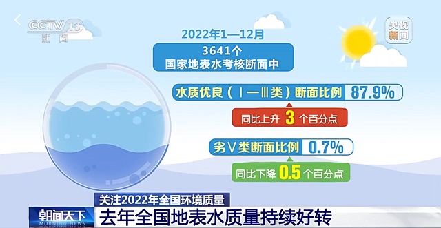 2022年1—12月,3641個國家地表水考核斷面中,水質優良(Ⅰ—Ⅲ類)斷面比例為87.9%,同比上升3個百分點;劣Ⅴ類斷面比例為0.7%,同比下降0.5個百分點。