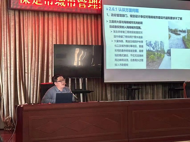 接著,馬洪濤教授針對規(guī)劃是基礎,構建全面科學的海綿城市規(guī)劃體系;方案是指引,編制合理系統(tǒng)的海綿城市實施方案;項目是根本,做好科學合理的海綿城市設計方案;機制是基礎,構建完整可行的海綿城市推進機制;模式是保障,選擇綜合統(tǒng)籌的海綿城市建設模式;交流是助力,形成通俗易懂的海綿城市語言體系等方面,結合其他城市建設經驗,針對保定實際,做了深入淺出、通俗易懂的細致講解。