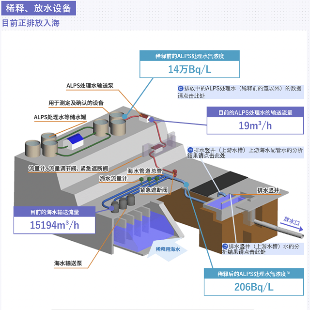 當?shù)貢r間8月29日21時的實時數(shù)據(jù)顯示,所謂“ALPS處理水”以每小時19立方米的速率流出管道,另一邊用于稀釋氚的海水以每小時15194立方米的速率流出,與“ALPS處理水”匯集,一同流向排水豎井,最終入海的核污水中氚濃度檢測值為206貝克勒爾/升。世衛(wèi)組織2017年發(fā)布的《飲用水質量標準》規(guī)定,飲用水中氚的含量不得超過10000貝克勒爾/升。