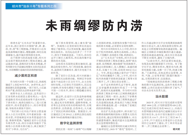排澇水是“五水共治”的重要內容。近年來,浙江省紹興市圍繞“滲、滯、蓄、凈、用、排”等工程措施,開展老舊小區改造及海綿城市建設,增強道路、綠化徑流調蓄能力,提升城市管網排水效率。