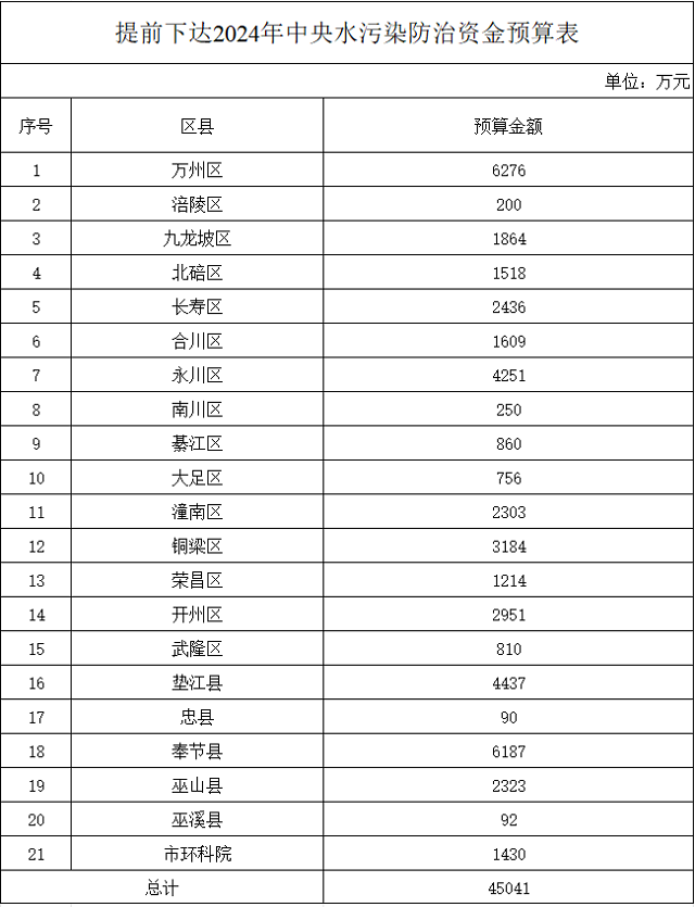 根據(jù)《重慶市財政局關(guān)于提前下達2024年中央水污染防治資金預算的通知》,為促進水環(huán)境質(zhì)量改善,加快推進水污染防治工作,筑牢長江上游重要生態(tài)屏障,根據(jù)財政部《關(guān)于提前下達2024年水污染防治資金預算的通知》(財資環(huán)〔2023〕111號)、《水污染防治資金管理辦法》(財資環(huán)〔2021〕36號)等文件精神,并按照重慶市生態(tài)環(huán)境局《關(guān)于商請?zhí)崆跋逻_2024年中央水污染防治資金預算的函》(渝環(huán)函〔2023〕625號),現(xiàn)將2024年中央水污染防治資金預算提前下達,專項用于水污染防治和水生態(tài)環(huán)境保護方面相關(guān)工作。