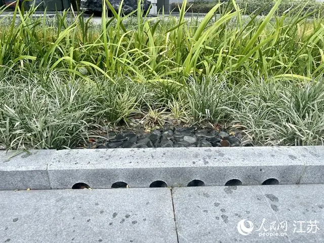 一處雨水花園內(nèi),圍住花園的路緣石上,開(kāi)了6個(gè)圓孔。看似普通的設(shè)計(jì),卻可以使雨水快速導(dǎo)入花園中,這是讓“海綿”吸飽水的第一步。