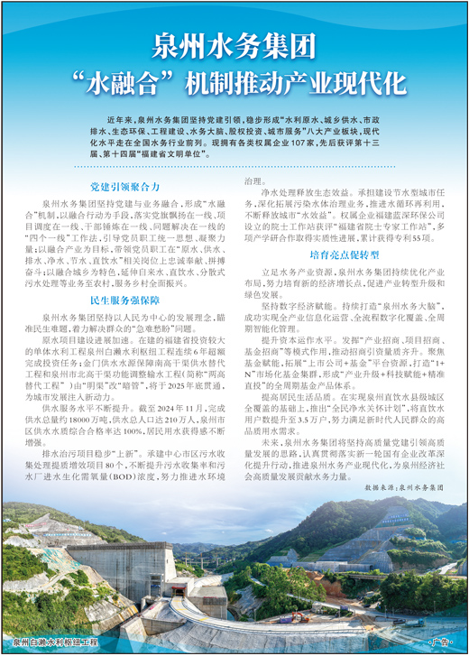 近年來,泉州水務集團堅持黨建引領,穩步形成“水利原水、城鄉供水、市政排水、生態環保、工程建設、水務大腦、股權投資、城市服務”八大產業板塊,現代化水平走在全國水務行業前列。現擁有各類權屬企業107家,先后獲評第十三屆、第十四屆“福建省文明單位”。