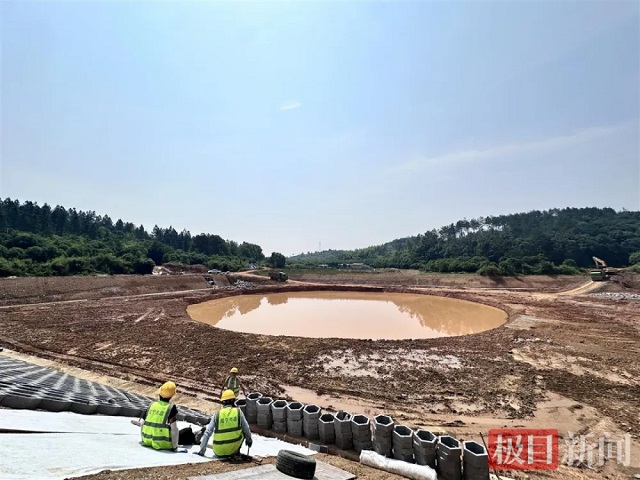 5月27日上午,楊下調(diào)蓄池建設現(xiàn)場的施工氛圍與天氣一樣火熱。在3號調(diào)蓄池建設現(xiàn)場,主體結(jié)構已完工,工人們正在進行護坡施工。極目新聞記者現(xiàn)場看到,該調(diào)蓄池位于一處丘陵地帶的低洼處,承接周邊大片山地、丘陵來水。調(diào)蓄池不僅能調(diào)蓄洪水,日常則可以作為灌溉水庫,為下游數(shù)百畝田地提供灌溉水源。