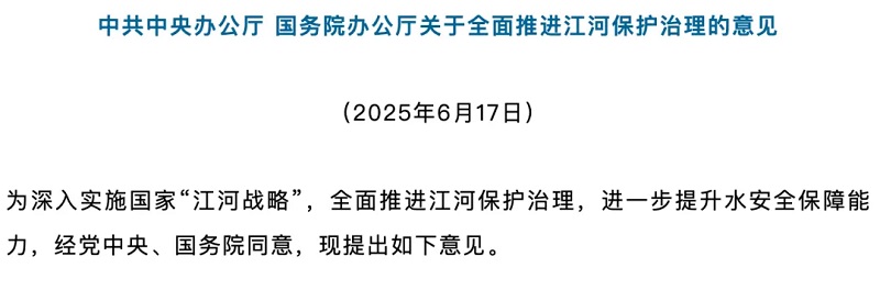首次明確將流域綜合治理 提升至國家戰略高度 2025年6月17日,《中共中央辦公廳國務院辦公廳關于全面推進江河保護治理的意見》(以下簡稱《意見》)正式發布。
