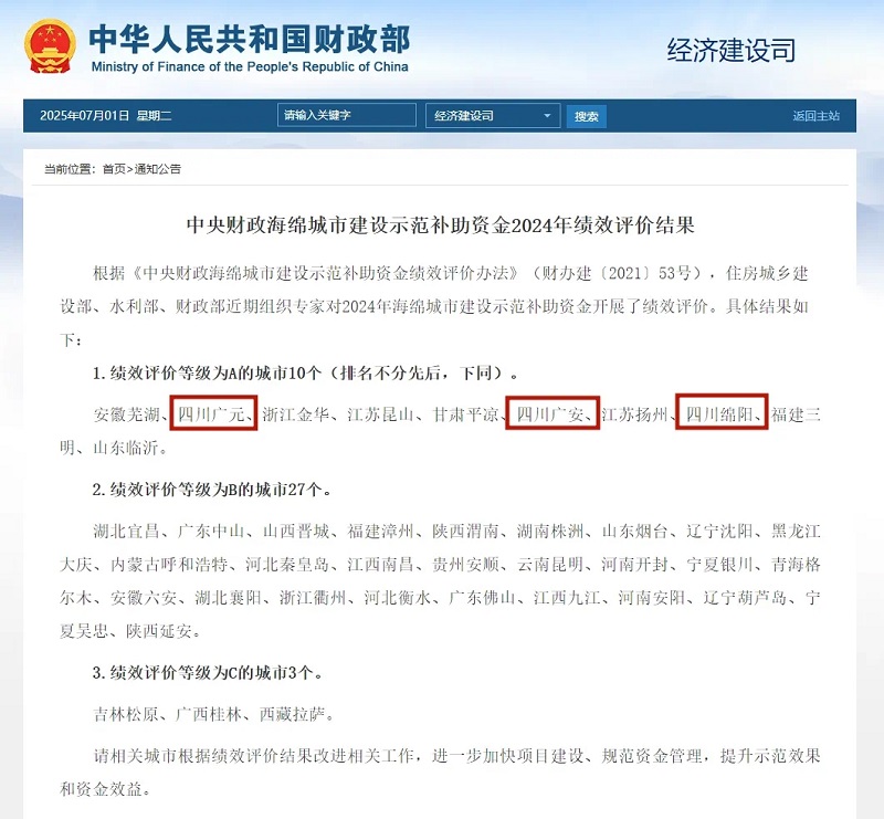 根據(jù)《中央財政海綿城市建設(shè)示范補助資金績效評價辦法》,住房城鄉(xiāng)建設(shè)部、水利部、財政部近期組織專家對2024年海綿城市建設(shè)示范補助資金開展了績效評價。評價結(jié)果顯示,共有10個城市績效評價等級為A,其中包括廣元市、廣安市、綿陽市等3個四川城市。